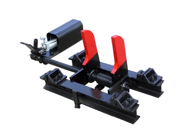 本實(shí)用新型公開了一種氣動(dòng)阻車器,包括刀擋、扭簧、力把、氣缸、軸架、軸、限位板和拉桿,軸架固定在限位板上,軸的遠(yuǎn)端穿過扭簧鉸接在軸架上,刀擋固定在軸上并與扭簧上端連接,扭簧下端固定在拉桿上,力把下端固定在軸的近端,力把上端與氣缸鉸接。該氣動(dòng)阻車器結(jié)構(gòu)簡(jiǎn)單,安全可靠,可以人工控制,也可以遠(yuǎn)程控制,實(shí)現(xiàn)集中自動(dòng)化管理。